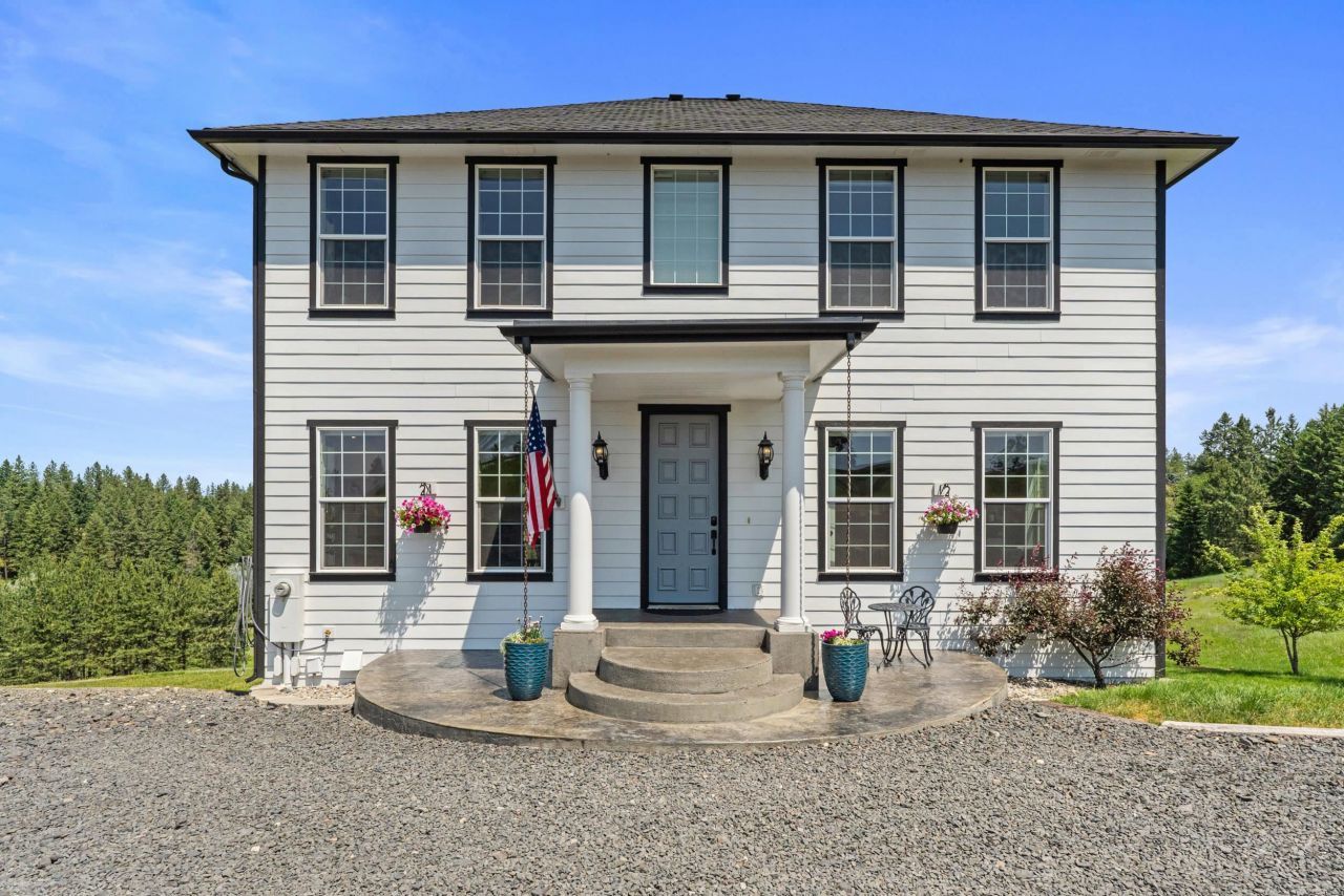 Discover this enchanting 6-bed, 4-bath Colonial on 9.69 acres, offering privacy and Mt. Spokane views. The main home boasts cherry and bamboo floors, crown molding, a library with built-ins, and a formal dining space. The primary suite features a jetted tub, separate shower, marble floors and a large walk in closet. Enjoy main floor or basement utilities and a 2200 KW whole-house generator. Two additional dwelling units provide incredible versatility: a 2-bed, 1-bath apartment above the 3-car garage (400 amp), and a separate 1-bed, 1-bath, 435 sq ft guest house. The expansive grounds include a chicken coop/sheep barn, apple, plum, and cherry trees, and a sprinkler system. This exceptional property offers refined living, natural beauty, and income possibilities. Own your private Greenbluff paradise!