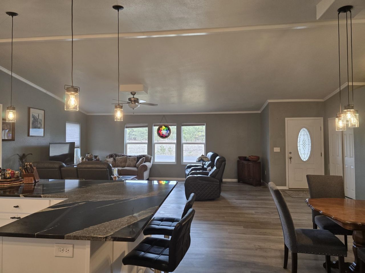Built in 2022, this stunning home offers contemporary living paired with breathtaking mountain views, visible from the expansive back deck and numerous windows throughout the property. Nestled in the desirable Pinebrook Addition on nearly an acre, the 3-bedroom, 2-bathroom residence blends comfort, style, and efficiency. Notable features include a durable 20-year composite roof, fiber cement siding accented with stone trim and ridge shake details on the gables, and low-maintenance composite decking. Energy efficiency is prioritized with an inverter heat pump and vinyl windows that maximize natural light and insulation. The chefs kitchen is equipped with sleek stainless-steel appliances, including a double oven and beautiful granite countertops. Inside, soaring cathedral ceilings with crown molding, AQUA seal water-resistant flooring, and tiled bathrooms enhance durability and style. The primary bathroom boasts a custom tile walk-in shower and a jetted tub, protected by advanced Schluter technology.